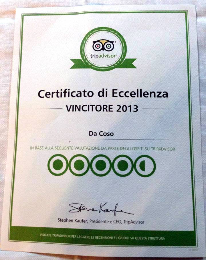 Giorni fa ci è arrivata questa gradita sorpresa da parte di TripAdvisor: il certificato di eccellenza per l’anno 2013.